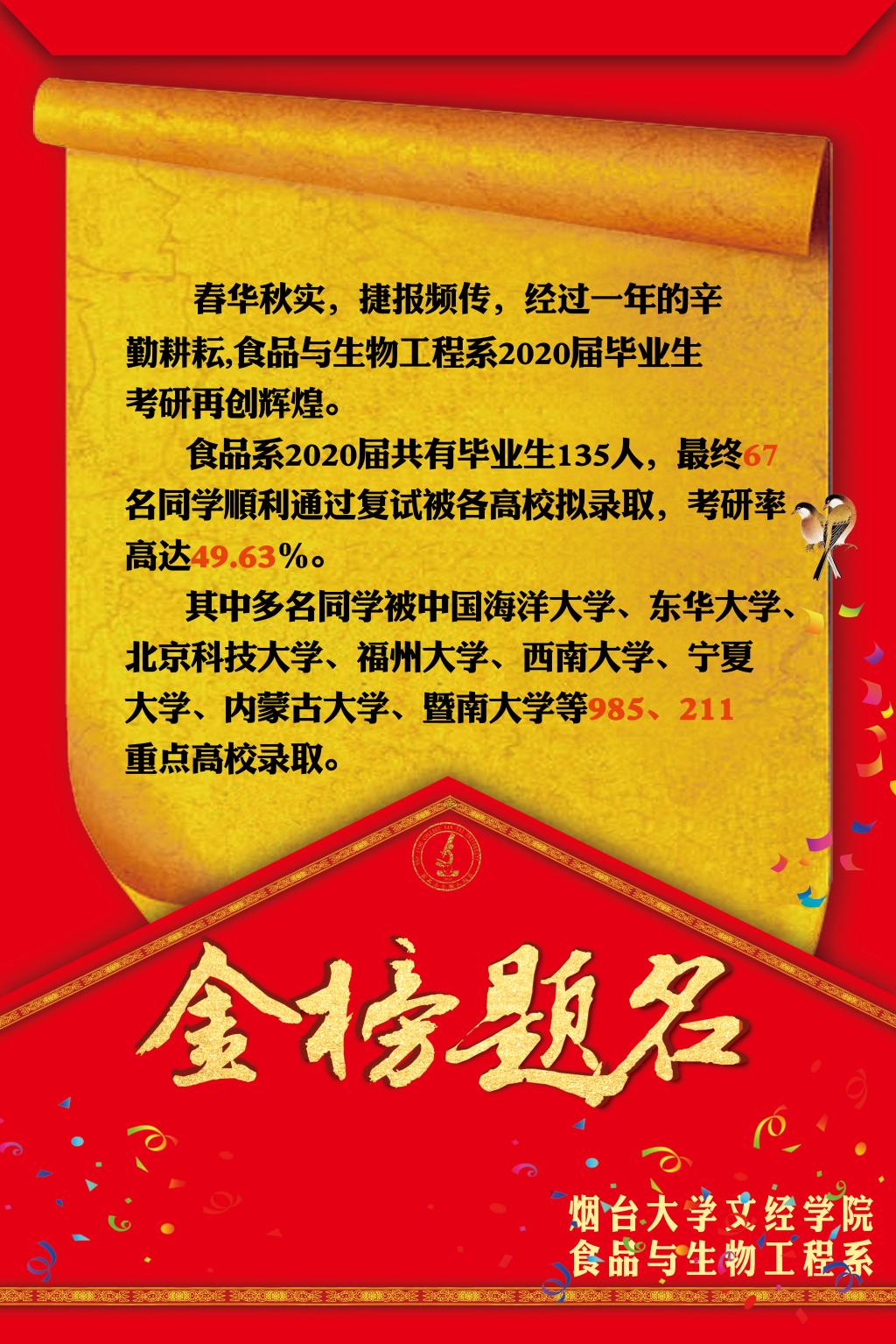 近日,随着2020年硕士研究生录取结果的陆续公布,食品与生物工程系考研学子捷报频传,录取人数再创新高!今年,食品系135名应届毕业生中,67名同学成功考取硕士研究生,录取率高达49.63%。其中,11名同学考取985、211院校,占考研成功人数的16.42%。女生434、436宿舍10名女生,全部考研成功,成为众人瞩目的“学霸”宿舍。