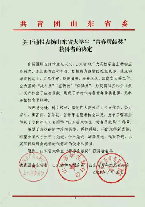 7月16日,共青团山东省委、山东省学生联合会与山东省青年志愿者协会联合发文通报表扬山东省大学生“青春贡献奖”获得者。我院文法系学生成晓悦、会计系学生李忆晴两名优秀青年榜上有名。