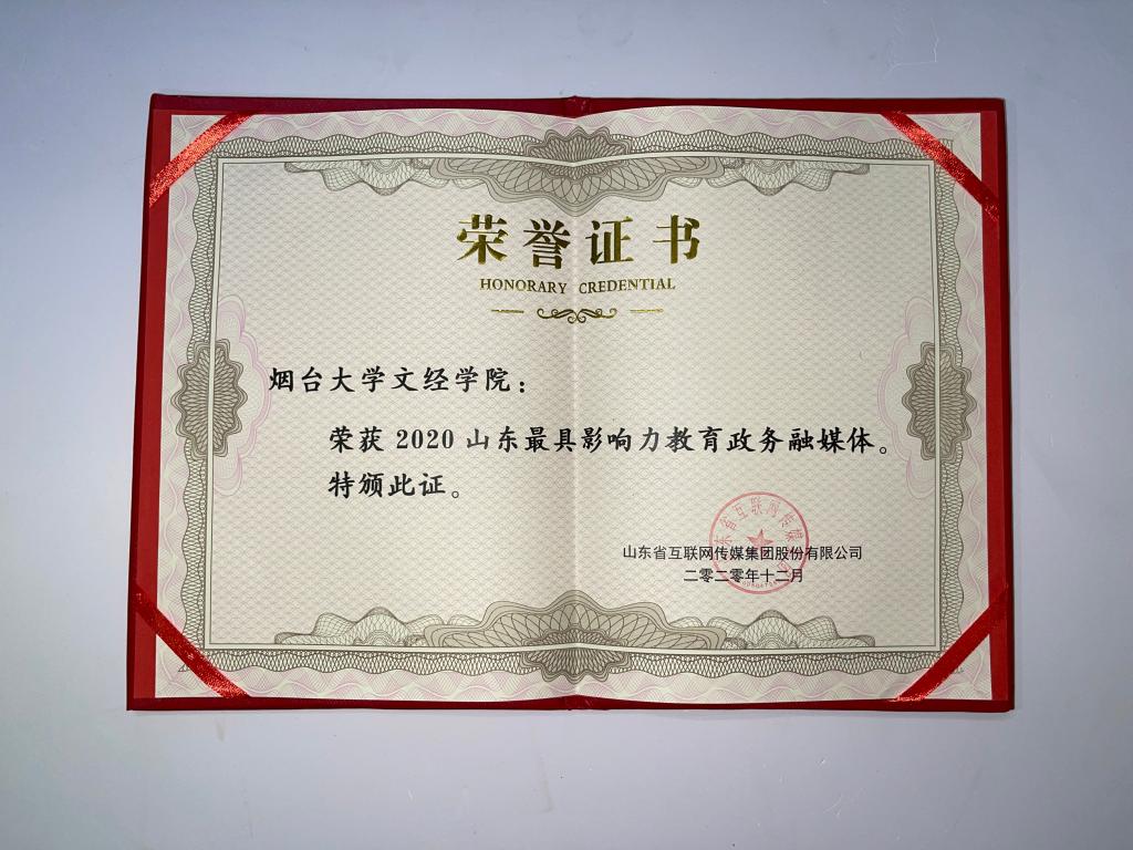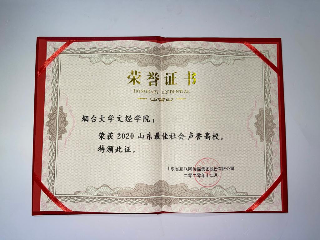 12月25日 “2020年山东教育品牌建设与传播管理研讨会”在济南隆重召开,来自山东省100余所高校的宣传部负责人与会。会上表彰了2020年在教育品牌建设与传播管理方面做出突出贡献的高校,我院不负众望,荣获“2020山东最佳社会声誉高校”和“2020山东最具影响力教育政务融媒体”两个奖项。其中,“山东最佳社会声誉高校”是自2019年以来,我院已连续两年获得该殊荣。