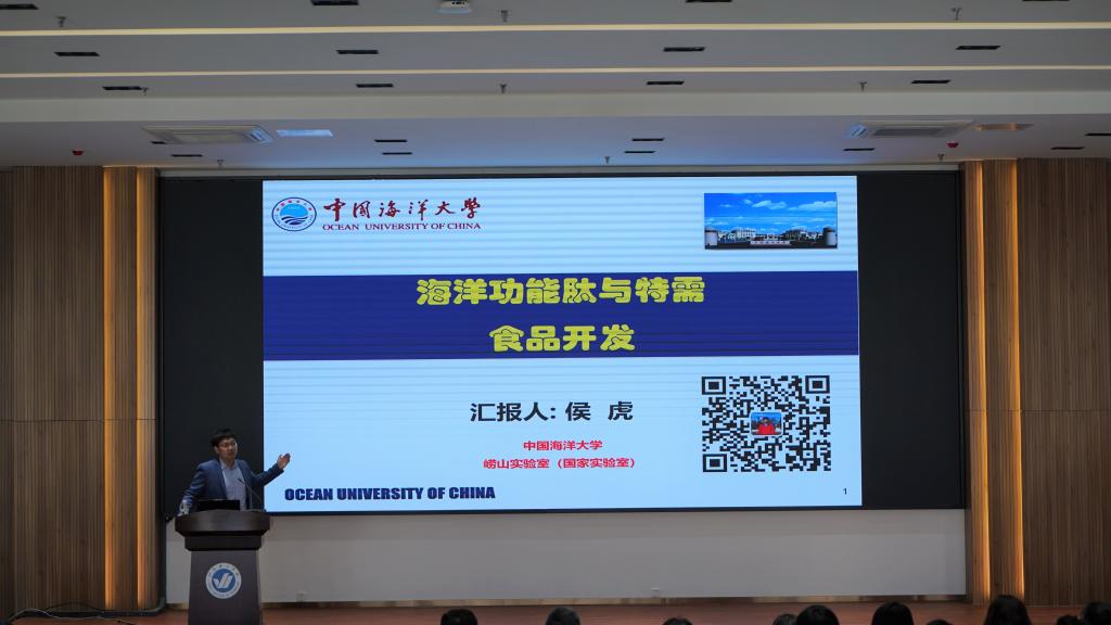讲座上,侯虎教授介绍了海洋功能肽中标志性成分溯源的科学思路,海洋抗菌肽筛查,海洋功能蛋白与肽的基础研究科研成果及关键制备技术与产品开发,分享了中国海洋大学西海岸校区建设为学科发展带来的重大契机,并发出了邀请。另外,为响应国家海洋战略定位和健康中国的国家大计,他还分享了特医配方食品开发的基本策略,从营养食品的配方、工艺、质量标准方面进行了阐述。