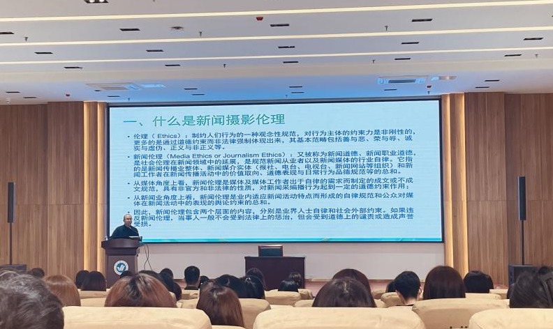甘教授以一段有趣的视频拉开了此次讲座的帷幕,从什么是新闻摄影伦理、新闻摄影伦理的五个失范问题和新闻摄影的法律问题三个方面展开讲述。每一点都结合丰富且具有超强代表性的案例来进行分析,其中重点介绍了新闻摄影伦理的失范问题:第一是新闻照片的造假,第二是人文关怀的缺失,第三是角色选择矛盾,第四是过度娱乐化,第五是新闻摄影侵权。