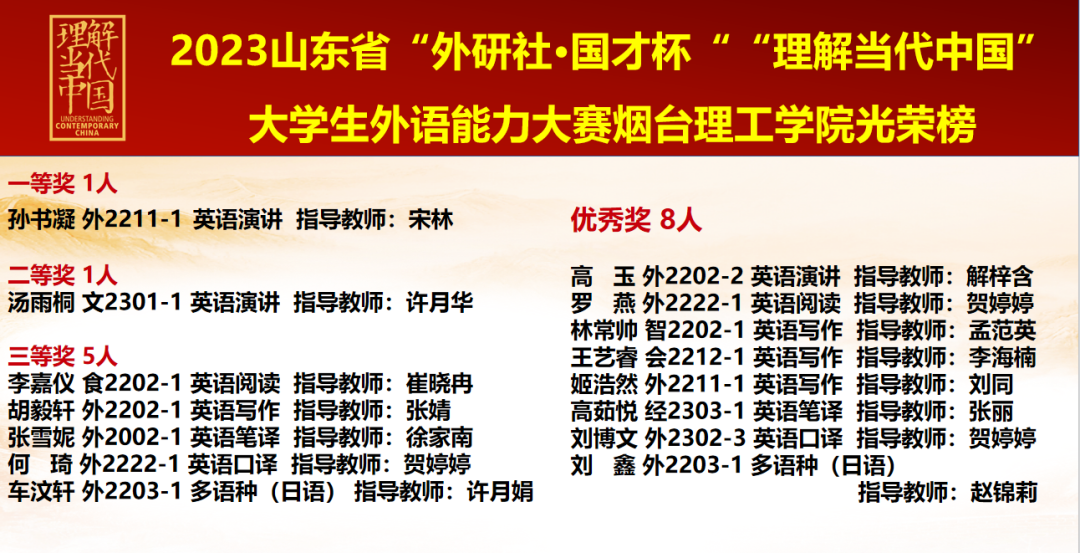 10月15日至11月4日,2023山东省“外研社·国才杯”“理解当代中国”全国大学生外语能力大赛在济南成功举办,我校的十五位同学获得优异成绩。