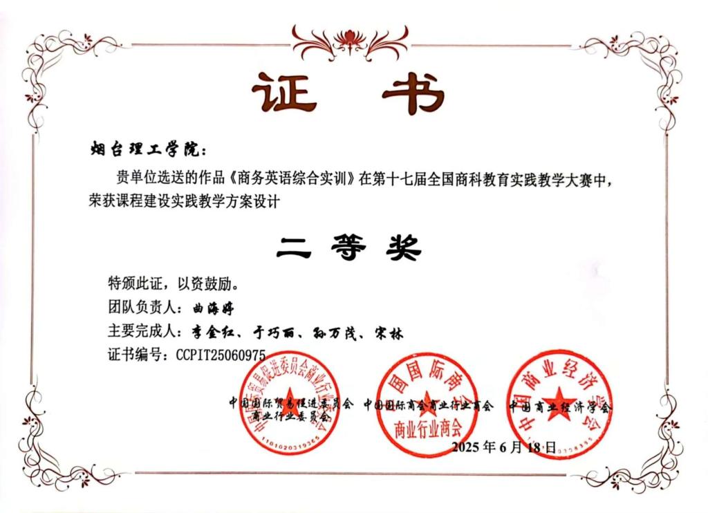 按照竞赛评审实施细则及竞赛章程要求,经院校、企业和机关单位推荐,部分赛区选拔,组委会初评、评选专家组复评、评审委员会审核,最终我校外国语学院孙万茂教师团队(成员:李工科、纪春艳、于巧丽)荣获国家一等奖;曲海婷教师团队(成员:李金红、于巧丽、孙万茂、宋林)荣获国家二等奖。