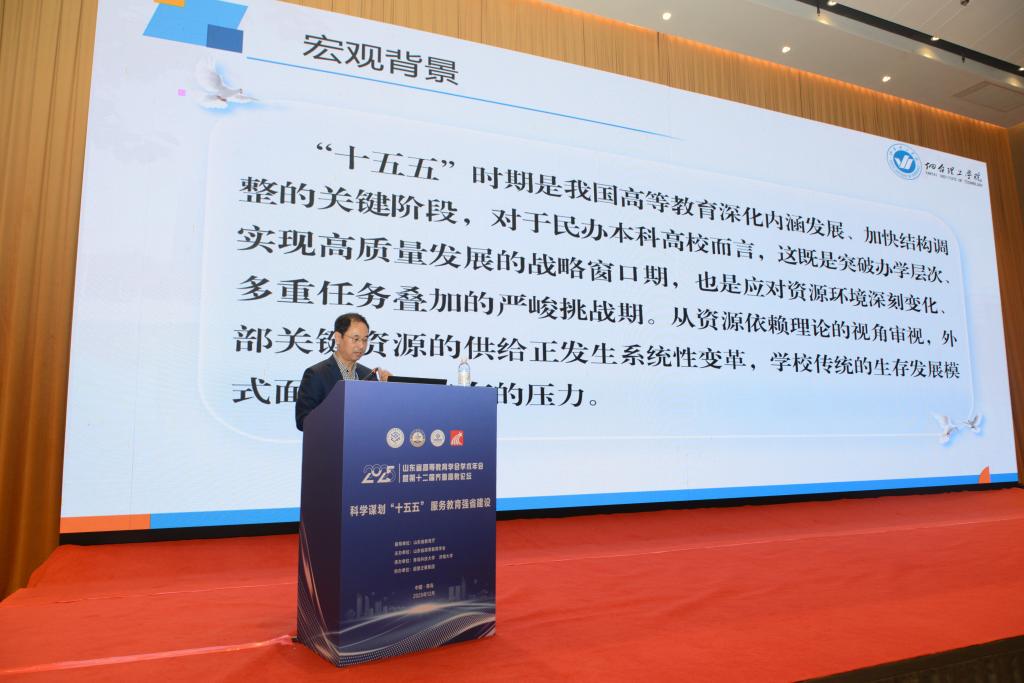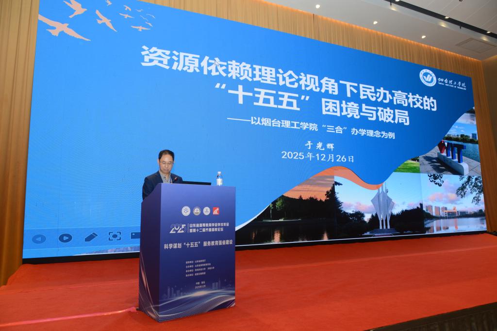 12月26日,山东省高等教育学会2025年学术年会暨第十二届齐鲁高教论坛在青岛海天金融中心酒店隆重举行。本次论坛以“科学谋划‘十五五’,服务教育强省建设”为主题,全省多所高校领导和专家学者参会交流。校长于光辉、副校长苏春景一行6人参加会议,于校长应邀在大会上作题为《资源依赖理论视角下民办高校的“十五五”困境与破局——以烟台理工学院“三合”办学理念为例》的主题报告。