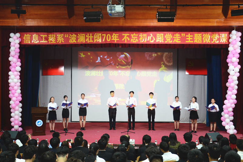 喜迎新时代,共筑中国梦,辉煌七十载,点亮新中国。为热烈庆祝中国共产党成立98周年,共迎中华人民共和国70周年伟大盛典,9月29日晚,信息工程系党总支组织开展“波澜壮阔七十年,不忘初心跟党走”主题微党课活动。党委书记唐家弘、副书记李荣梅、学院管理总督导杜希成、组宣部部长张琼玉,信息工程系副主任原帅、党总支副书记申海滨、教工党支部书记荆蕾、学生党支部书记祝箐出席活动,信工系全体师生党员、入党积极分子及2019级新生现场聆听微党课。