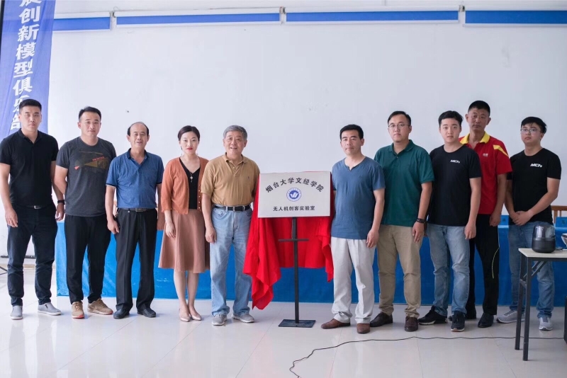 烟台沐晨创新模型俱乐部创始人孙俊阳、宋英豪,院长助理史毅,就业创业部部长李洁共同为无人机创客实验室揭牌。