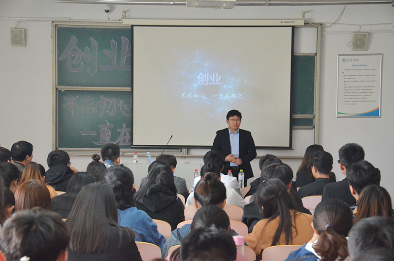当天下午,袁晋洲以“创业不忘初心,一直在路上”为题,为母校学弟学妹作了创新创业主题讲座。他结合自己的求职与创业经历,为文经学子“双创人生”再添新动力。