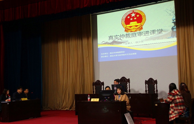 2017年4月7日,烟台大学文经学院文法系特邀烟台仲裁委员会走进校园,举办真实仲裁案件的公开审理活动,为法科学生上了一堂生动的法律实践课。烟台仲裁委员会审理二科科长徐少杰担任主审人,文经学院教务部部长董新红、人事部副部长于静、文法系副主任林莎及法学专业近500名师生旁听了此次仲裁庭审。