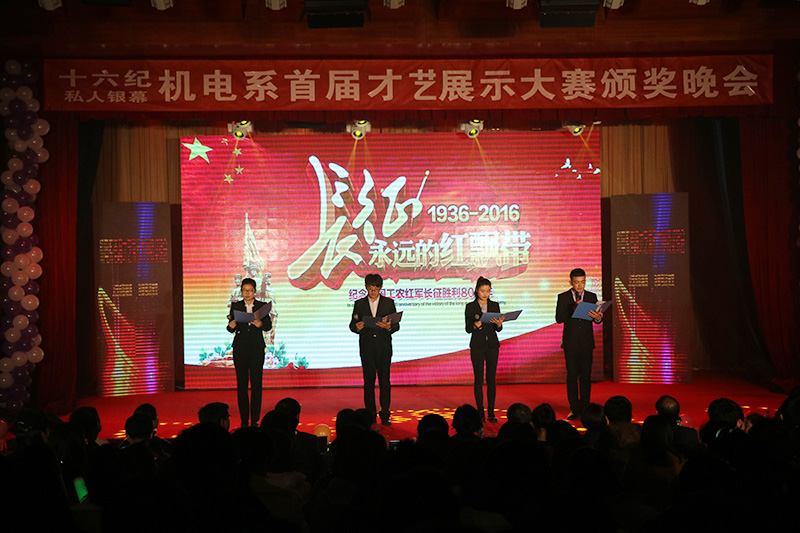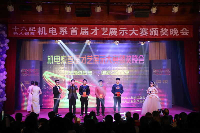 “才艺成就梦想,创新引领未来”,12月6日晚,由机电工程系举办的首届“魅力机电秀”才艺展示大赛颁奖晚会在一教多功能厅举行。学院办公室主任史毅、学工部部长杜希成、招生就业部部长张琼玉等有关部门负责人与会,机电系师生参加了颁奖晚会。
