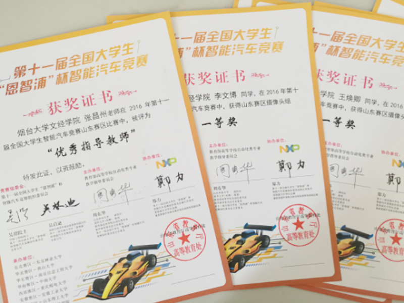 近日,第十一届全国大学生“恩智浦”杯智能汽车竞赛(山东赛区)在山东理工大学西校区举行。烟台大学文经学院张昌州、秦庆磊老师带队参加比赛,并出席闭幕式。经过三天激烈角逐,烟台大学文经学院派出的2支代表队分别获得山东省一等奖1项,优胜奖一项,并且张昌州老师被评为2016年第十一界全国大学生智能汽车竞赛山东赛区“优秀指导教师”。