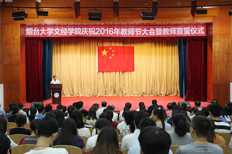 “珍惜教师荣誉,争做党和人民满意的好老师,为学院建设与发展贡献智慧和力量……”烟台大学文经学院50余名新进教师高举右手,面向国旗庄严宣誓。9月8日下午,学院2016年教师节庆祝大会暨教师宣誓仪式于学院多功能厅拉开帷幕,共同庆祝第32个教师节。院长于光辉,党委书记、副院长李相然,副院长王来武、刘孔庆、辛连军,院长助理尤敬法、莫红菊,各系部、各职能部门负责人以及全院教职工与会。副院长王来武主持会议。