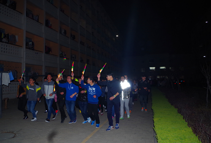 当晚19:00,随着一声哨响,学院6栋公寓灯光瞬间熄灭,学生们纷纷走出宿舍、走向操场参加了“young青春 不打烊”荧光夜跑活动。在领跑人员带领下,众多学生自发加入到夜跑人群中,用实际行动去拥抱健康环保生活。一时间,挥舞着荧光棒、涌动的人群成为这个夜晚独特的风景线。