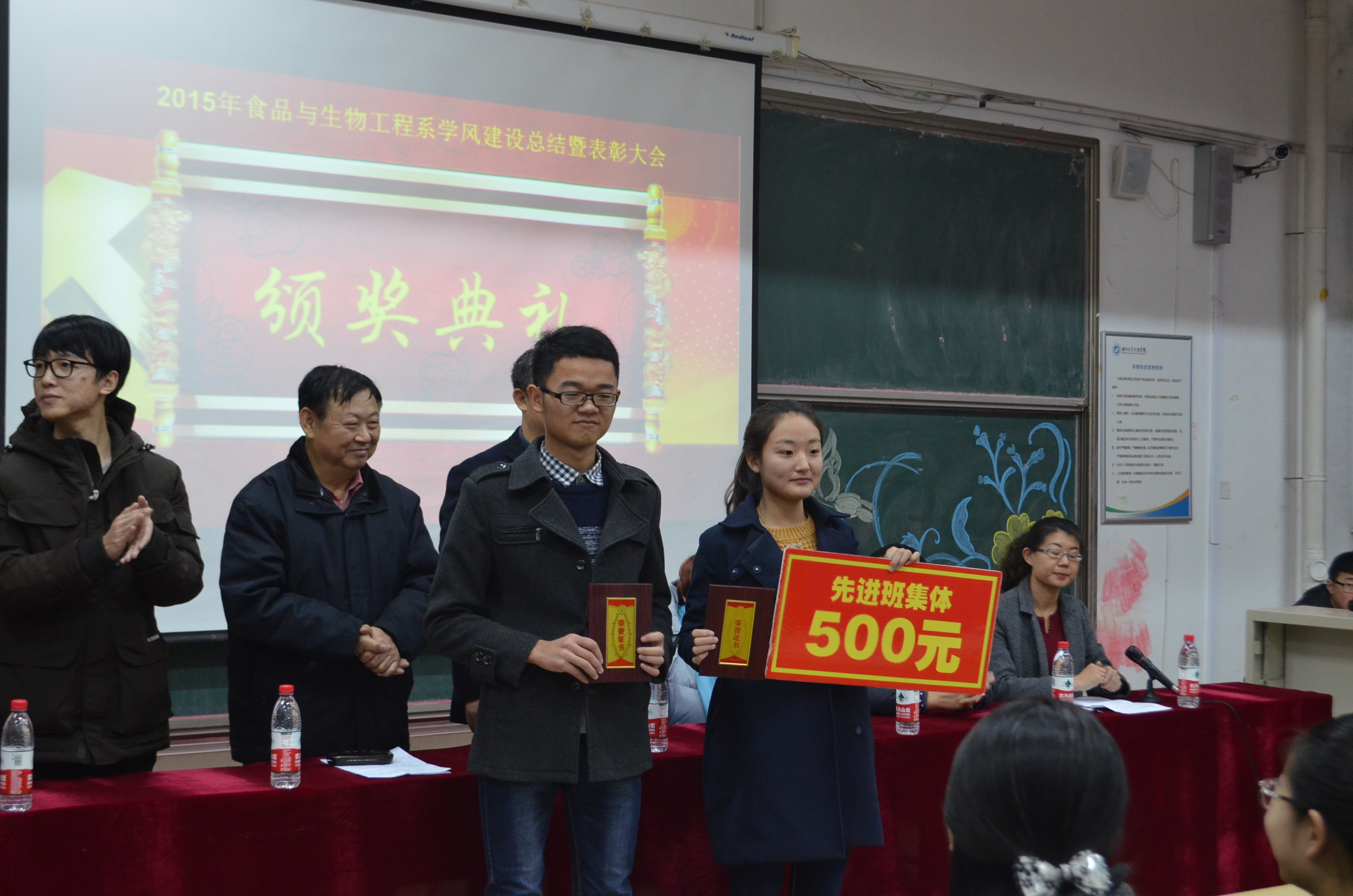 食品系党支部书记王少辉宣读了2015年食品系表彰决定,随后,系领导为获奖先进集体和个人颁发奖状和证书。先进个人代表、国家奖学金获得者、文生135-1班崔艳艳以自身经历讲述了大学期间要不畏挑战,多学多实践,把努力变为一种习惯。优良学风班代表、文食144-1班团支书钱豪文分享了所在班级在学风建设、班风建设、文体活动等方面的经验。