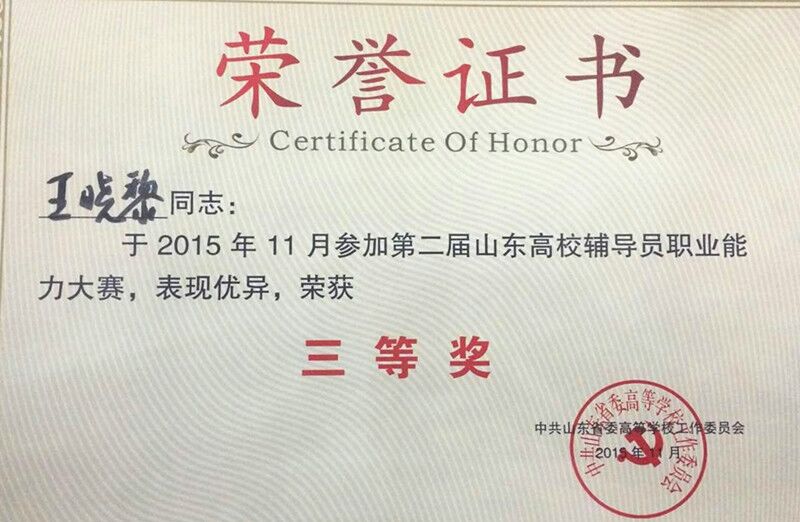 王晓黎老师获山东高校辅导员职业能力大赛三等奖