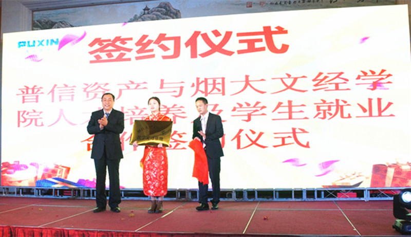 11月21日,经济系与普信资产管理有限公司共建实习基地签订暨挂牌仪式在烟台东山宾馆举行。副院长刘孔庆,经济系主任崔亚娜、党支部书记杨帆,普信资产管理有限公司总裁管寰宇、分公司总经理张树祥出席揭牌仪式。普信资产管理有限公司杰出职工代表、经济系教师代表参加活动。