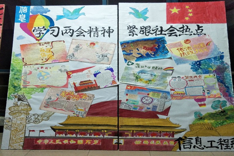 为了积极响应学院学习两会精神的号召,引领健康向上的校园风尚,营造风清气正的校园环境,将文化建设融入校园文化生活中,3月26日,信息工程系在一教大厅开展“两会,学习进行时”手抄报展示活动。