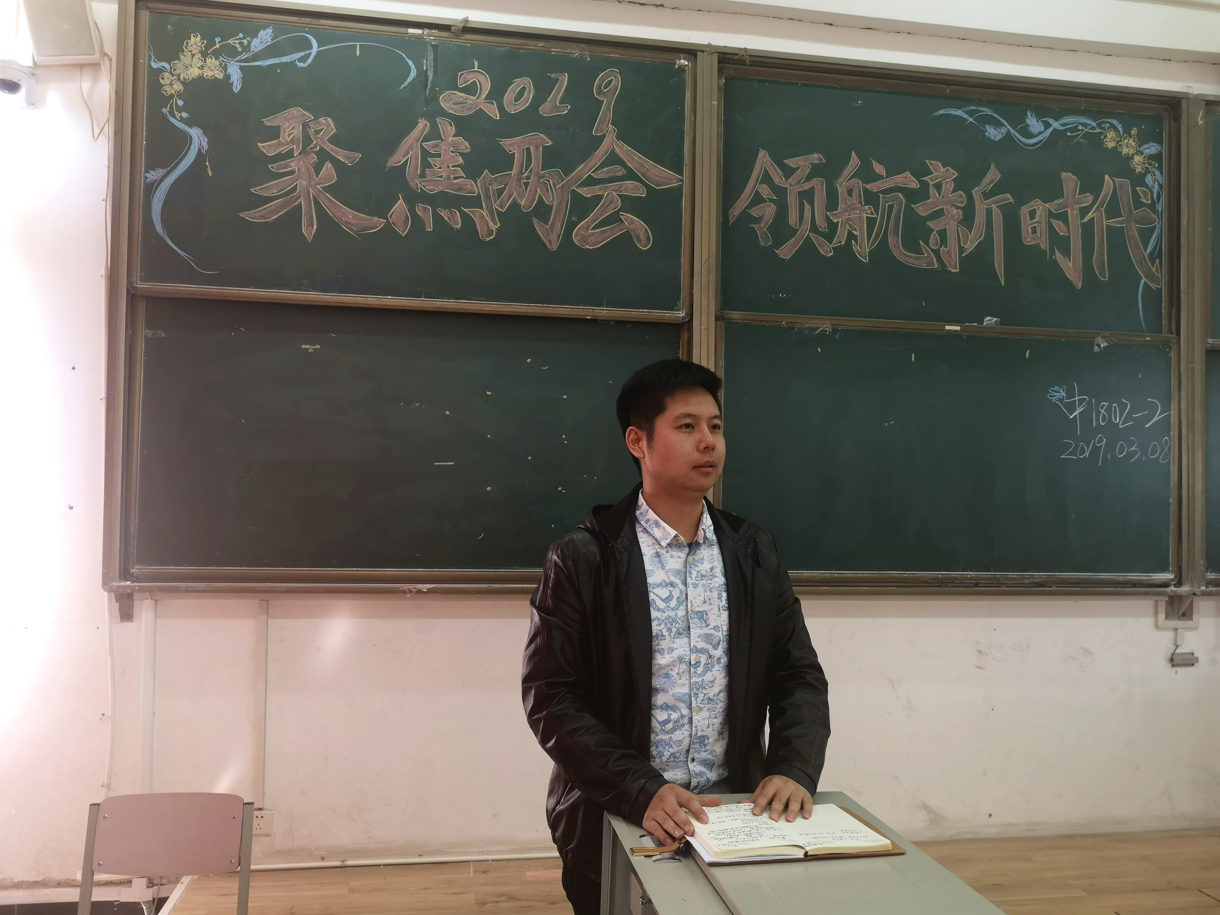 为深入学习贯彻全国“两会”精神,增强学生政治理论素养,提高政治站位,3月8日上午,文法系中1802-2班于一教604教室召开“聚焦两会,领航新时代”主题团日。班主任吕超及全体同学参加本次团日活动。