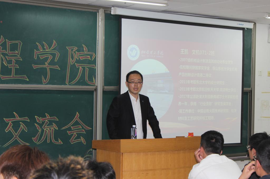 2021年4月17日,我校烟台大学文经学院正式更名为烟台理工学院。在这具有重大意义的一天,我校邀请到了教育界的各类专家学者与知名校友返校一同见证这历史性的一刻。我机电工程学院邀请到了07级的优秀知名校友——王凯同学。王凯同学自从我校毕业后成功考入东北大学研究生,后通过不懈努力成为北京航天航空大学博士。现工作于中国运载火箭技术研究院航天材料及工艺研究所。