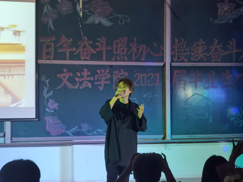 本次晚会共分为“栉风沐雨传承红色基因”“奋斗青春笃定前进航向”“初心永挚逐梦崭新未来”三个篇章。晚会首先通过视频的形式回顾了21届毕业生四年的大学生活,随后通过歌曲、舞蹈、话剧、相声、走秀等多种节目形式表达对毕业生的祝愿。开场曲国乐合鸣《破阵乐》点燃了现场的气氛;话剧《智取威虎山》展现党员豪情;舞蹈《沂蒙女儿》致敬百年峥嵘;歌曲《新征程》聚焦十四五,擎画中国号蓝图;舞蹈串烧《Lip&Hip》《we rock》活泼热烈,欢乐气息弥漫会场;歌唱表演《想把我唱给你听》展现了懵懂美好的校园情谊;反串走秀点燃全场,引起阵阵欢呼。晚会过程中,毕业班班级负责人为班主任送上献花与礼物,他们最后一次以文法学院学生的身份与老师合影留念。最后,一首《不说再见》将晚会拉向高潮,本次晚会圆满落幕。