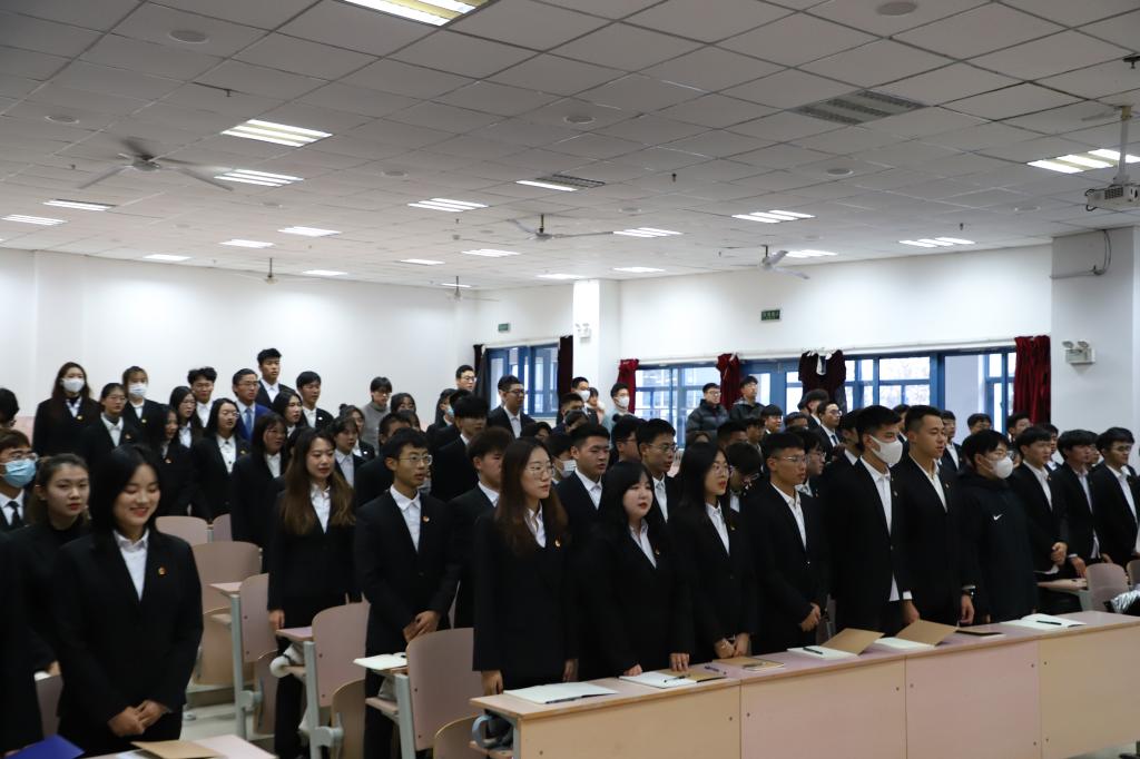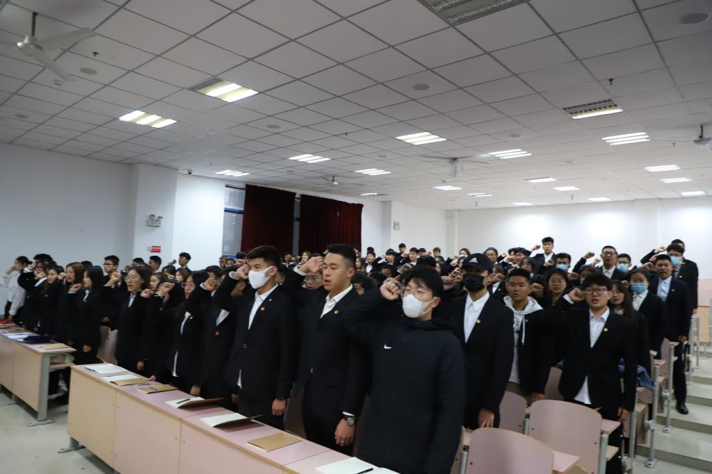 典礼在庄严肃穆的国歌中正式拉开帷幕。首先由学员代表:机电工程学院于景豪、建筑工程学院赵一帆上台领誓,带领全体学员重温入团誓词,全体学员面向团旗,紧握右拳,庄严肃立。紧接着由学员代表:建筑工程学院董浩、机电工程学院傅金铭宣读“青马工程”培训流程及学员守则。