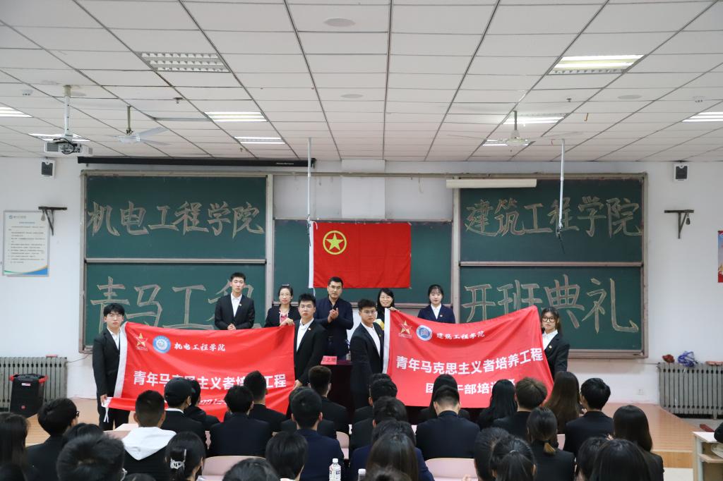 会议最后由建筑工程学院团总支书记臧延云老师、机电工程学院团总支书记包微老师为“青马工程”班授旗。
