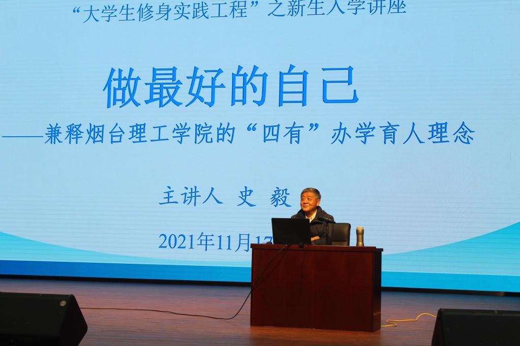 讲座伊始,史毅老师对烟台理工学院“有灵魂、有温度、有责任、有特色”的“四有”办学育人理念进行介绍。同时强调每一位同学都是可造之材,都有自己的个性,肯定和鼓励同学们的每一点改变和进步,致力于帮助每一位学生以最好的自己走向社会。接着,史毅老师列举了华为“天才少年”王霁、杜晓彤等多位学生的例子,提醒同学们成功没有捷径,一步一个脚印才能不断收获,不论顺境还是逆境,都要做闪闪发光的自己。最后,史毅老师引用鲁迅先生名言“哪里有天才,我是把别人喝咖啡的时间上用在写作上”,告诫同学们勇于战胜自己的恐惧,战胜自己的欲望,战胜自己的陋习,争取做最好的自己!