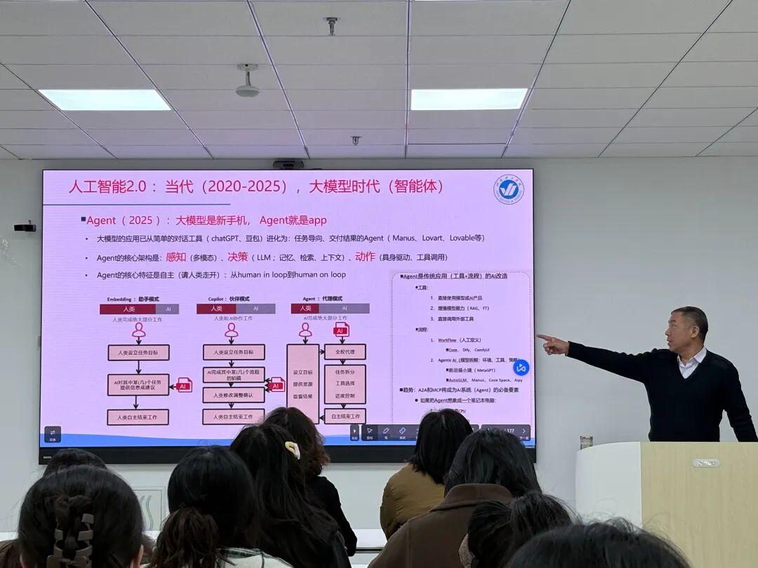 在教学实践应用板块,糜院长结合文科教学特点指出,AI可有效破解传统教学中“资源生成慢、互动形式单一、个性化不足”等痛点:既能快速生成教案、PPT等教学资源,减轻教师备课负担;又能依托智能体交互技术设计沉浸式课堂活动,推动教学模式从“统一供给”向“个性化适配”转型。谈及教师科研工作的赋能,他表示AI能够高效解放科研人员的文献整理、数据统计等重复劳动,助力教师聚焦创新性思考,实现科研工作的精准化、高效化。